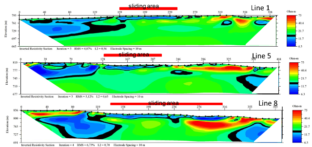 The survey successfully revealed risky areas at the survey site. The section determined by the black contour line in the 2D section (See image titled "2D Sections" by clicking the image to the right) is considered as the unit with slip potential. The area between 59m and 249m on Line 1 is the ongoing boundaries of the sliding zone. The other sliding zones are highlighted on each 2D section. Although the unit on the left side is the same, the lower-upper unit relation, the chemical component differences seems to be stable due to topographic inclination.