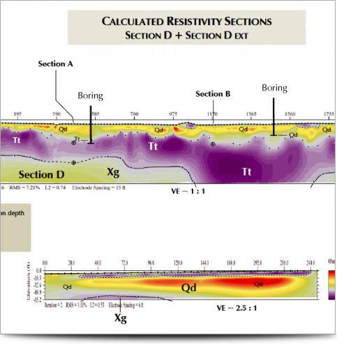 Inspection of Sections A through D reveal that an adequate correlation exists between the resistivity data and boring logs for holes drilled nearby the resistivity arrays. For instance, reasonably close to very close resistivity data – borehole data correlations enabled higher-confidence Tt surface picks throughout the extent of each resistivity model.